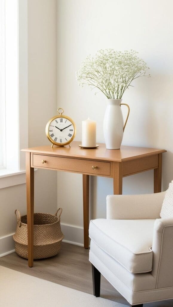 ✔ Keep the surface clear by limiting items to the essentials: a small lamp, a calming plant, and perhaps one beautiful notebook or clipboard.