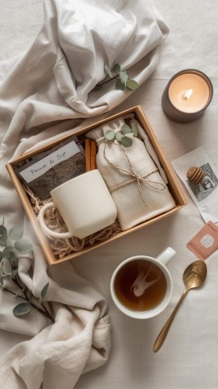 - Herbal tea sampler with a handwritten “pause & sip” note