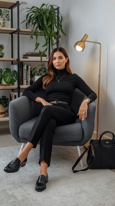Slim black turtleneck tucked into tailored trousers with loafers or ankle boots.