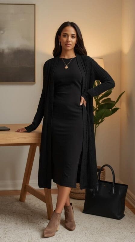 5. Black Midi Dress with Cardigan
