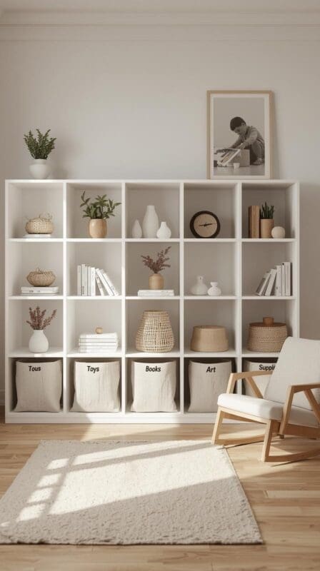 - Alternate open cubes (books, decor) with fabric bins (toys, cords).