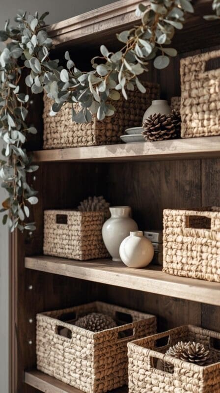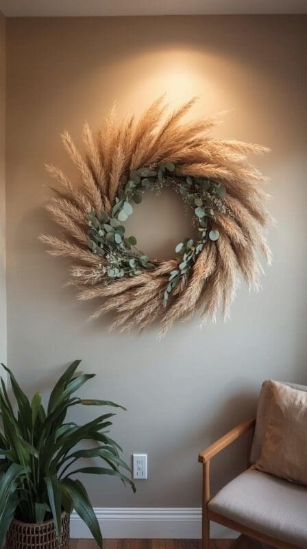 Why it works: Plants, garlands, and dried flowers create a fresh yet rustic atmosphere. Eucalyptus sprigs, pampas grass, and pinecones bring seasonal cheer without overwhelming the space.