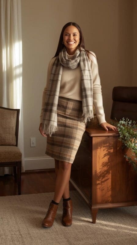 Why it works: Plaid adds texture and seasonal charm without feeling like a costume.