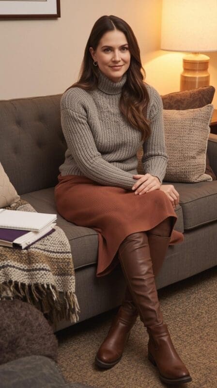 Wool or corduroy midi skirts look seasonal and pair beautifully with tall leather boots. Add a slim sweater tucked in for balance.