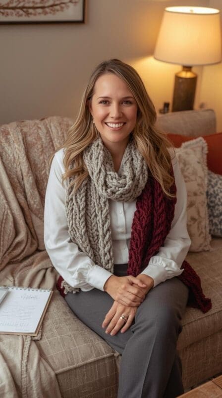 Sometimes a single accessory makes the whole look. A chunky knit scarf in cream, gray, or burgundy adds cozy winter charm to a simple blouse and trousers.