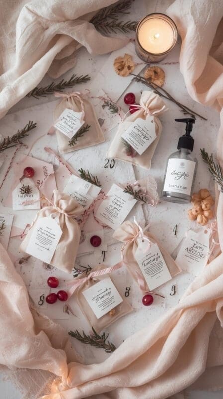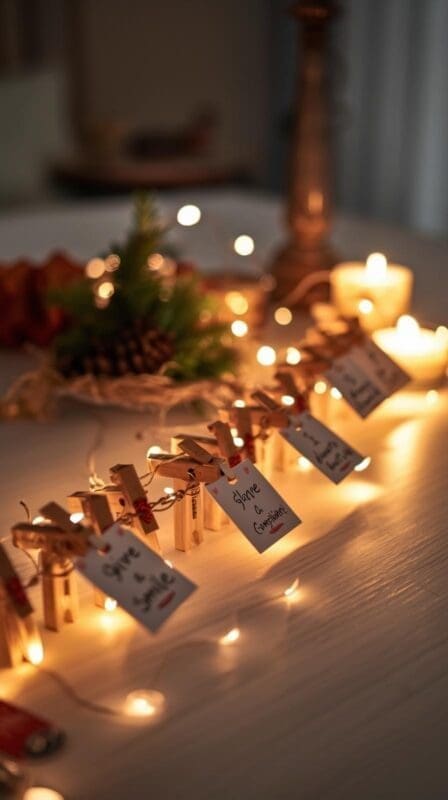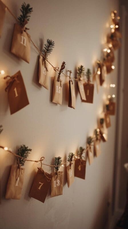 Use 24 decorated envelopes pinned on a string. Slip in notes, affirmations, or small treats. String 24 decorated envelopes across a mantel. Tuck in jokes, stickers, or tiny missions (e.g., “Read by twinkle lights for 10 minutes.”).
