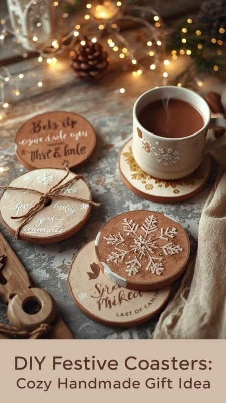 Festive coasters are a budget-friendly handmade decor idea that feels personal yet practical. They protect tables while adding a touch of seasonal charm — perfect for a counselor’s office, coffee nook, or cozy living room setup.