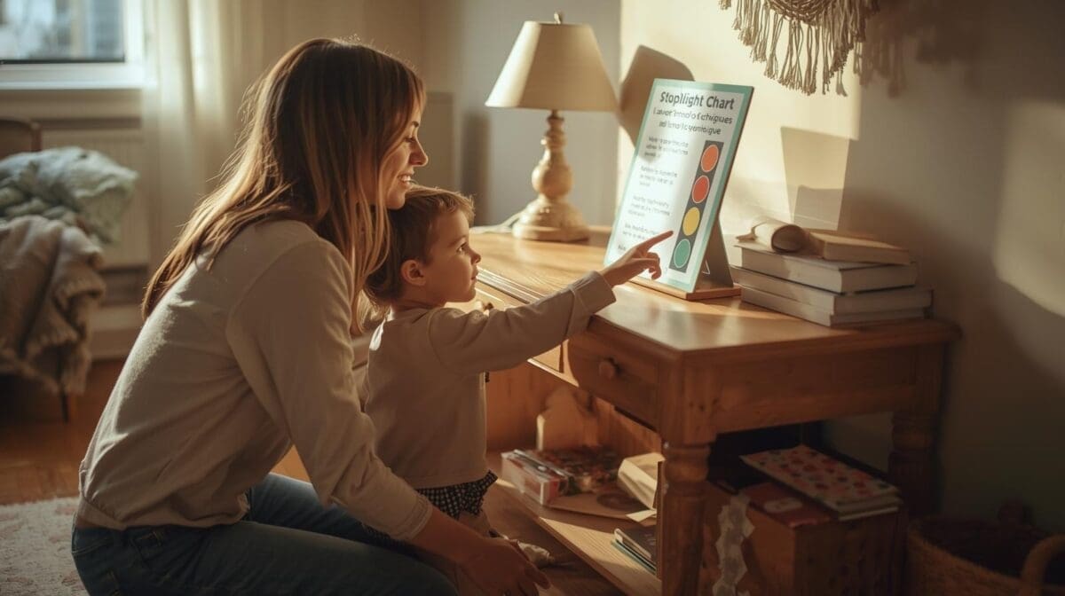 - Use visuals like a stoplight chart: Red = Stop, Yellow = Think, Green = Go.