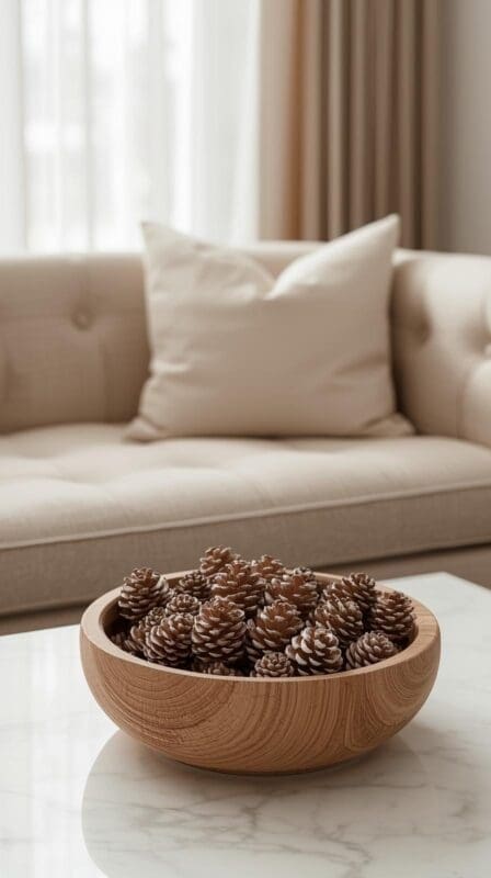 Instead of sprinkling holiday decor everywhere, pick one focal piece. A wreath, a branch arrangement, or a bowl of pinecones is enough.
