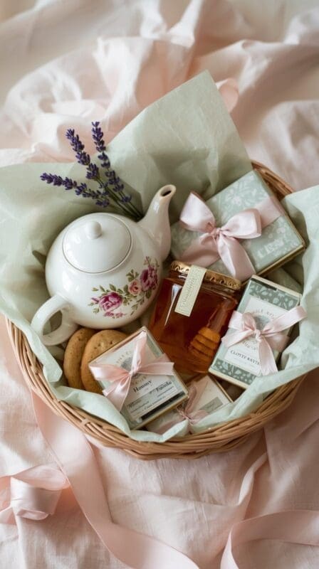 For a more delicate version of a relaxation basket, create a tea-lover’s dream. Combine a small teapot, a sampler of loose-leaf teas, honey sticks, and buttery shortbread cookies. Stick to calming colors like cream, sage, and blush for your presentation.