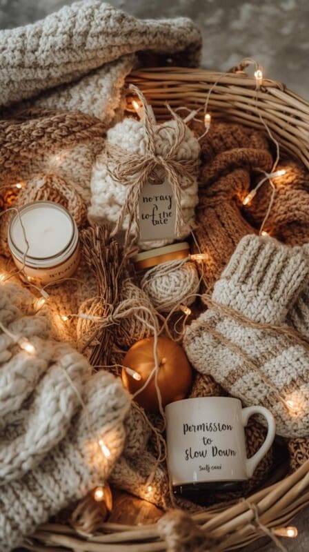 Few things are as universally appealing as a cozy evening at home. Fill your basket with fuzzy socks, a soft blanket, a candle, herbal tea, and a mug labeled “self-care.” Wrap it all in a woven basket lined with flannel or linen for texture. Add a handwritten tag that says, “Permission to slow down.”