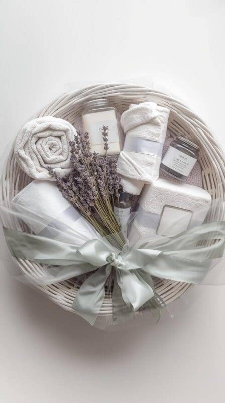 Group items by color or scent — lavender, eucalyptus, or rose work beautifully. This basket sells because it lets people feel pampered without leaving home.