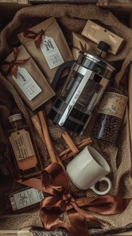 Coffee baskets are classic for a reason — they fit almost anyone and look sophisticated. Include specialty beans, a French press, flavored syrups, and a few artisan biscotti. Add a charming detail like a note reading, “May your mornings be calm and caffeinated.”