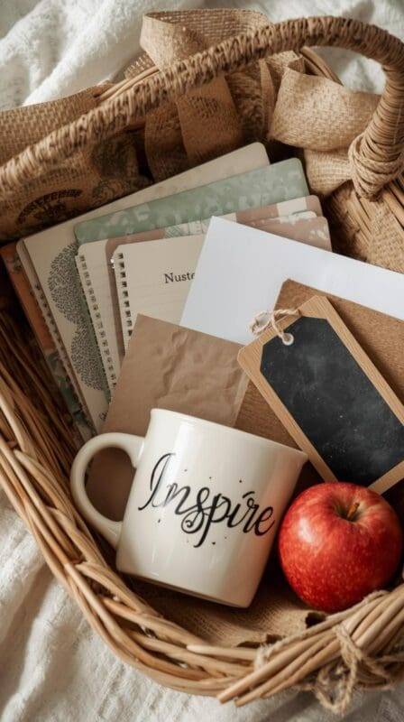 Teachers love practical gifts with heart. Include notebooks, pens, self-care treats, and coffee gift cards.