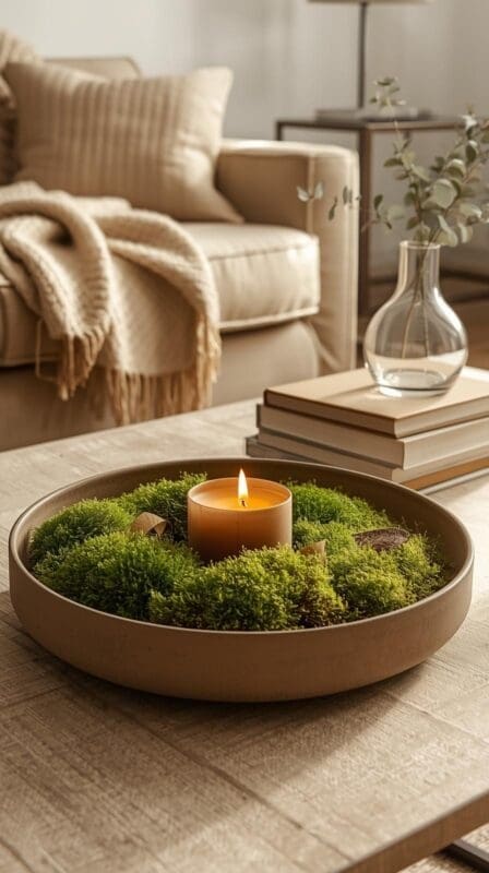 A shallow ceramic bowl filled with preserved moss becomes a minimalist centerpiece. Place on a coffee table for tactile grounding.