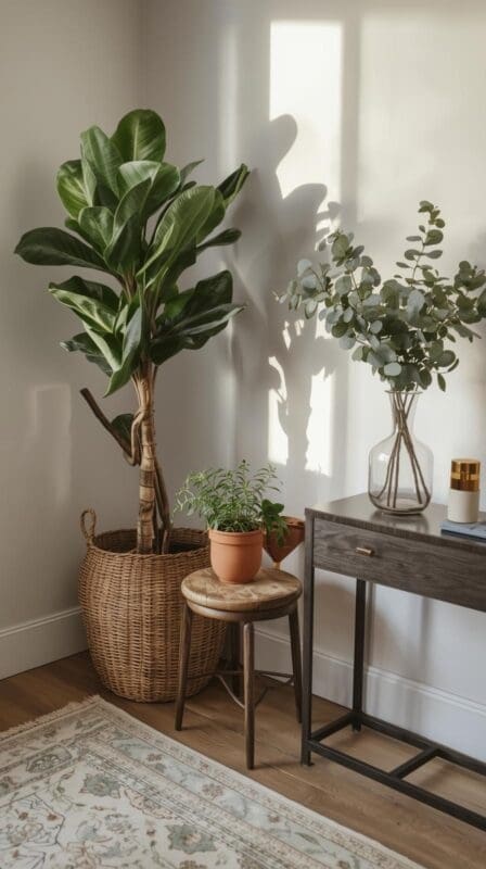 Fresh plants can be tricky in low light. Dried eucalyptus branches offer the same calming greenery with no upkeep.