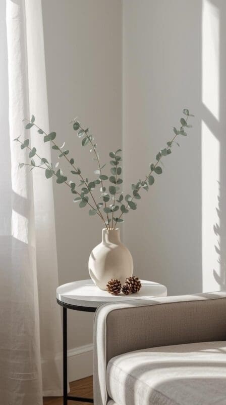 • Style a low arrangement: pinecones, evergreen clippings, or eucalyptus in a ceramic vase.